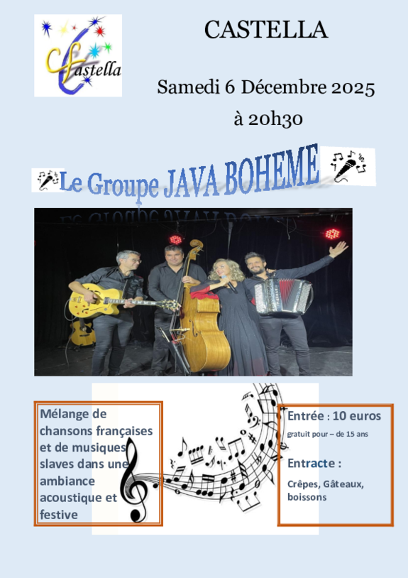 Afin de clore l'année en chansons, le Comité des fêtes de Castella vous propose de venir voir le groupe Java Bohême.